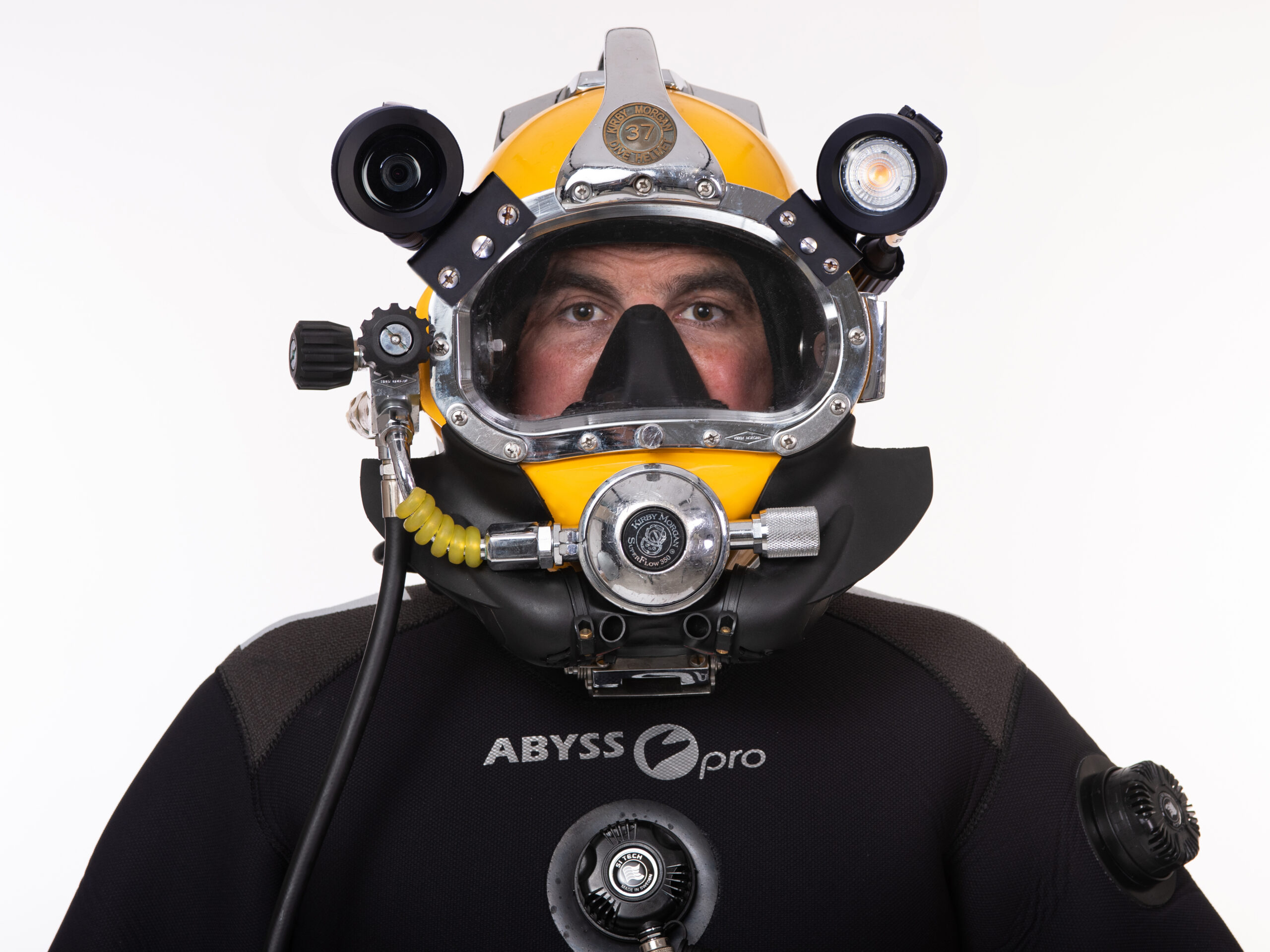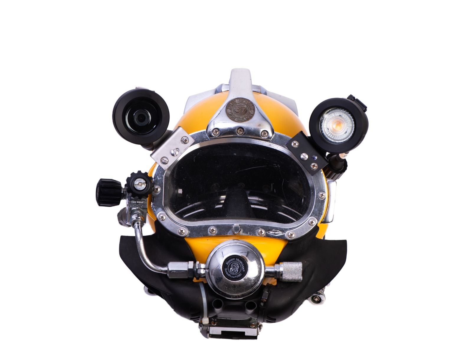 Incluye bracket compatible con cascos y máscaras Kirby Morgan. Su geometría equilibrada minimiza interferencias en el campo visual del buzo.