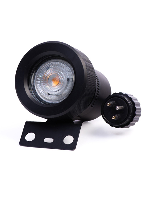 Foco LED subacuático profesional de 10 W y 2000 lúmenes, diseñado para buceo comercial hasta 100 m. Haz concentrado de 45°, carcasa en Delrin® anticorrosión y conector flexible reforzado. Compatible con cascos y máscaras Kirby Morgan. Disponible en versión IL2M y MC-3M.